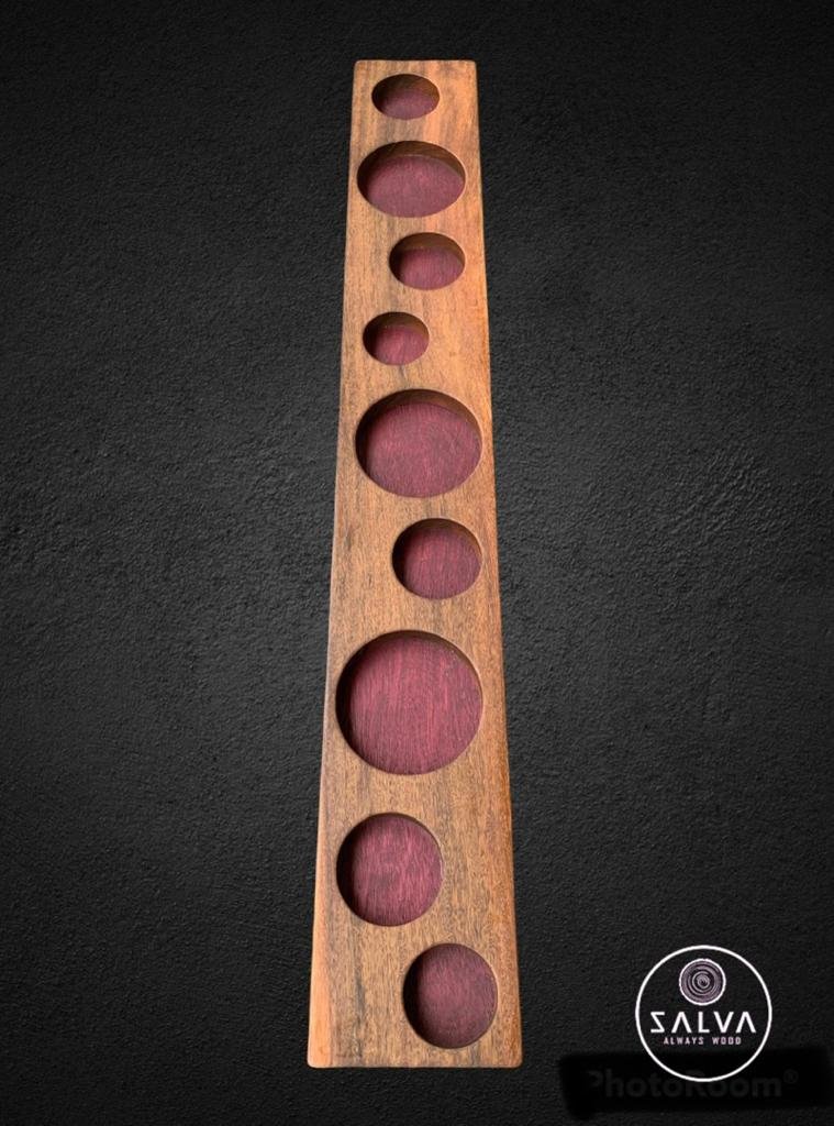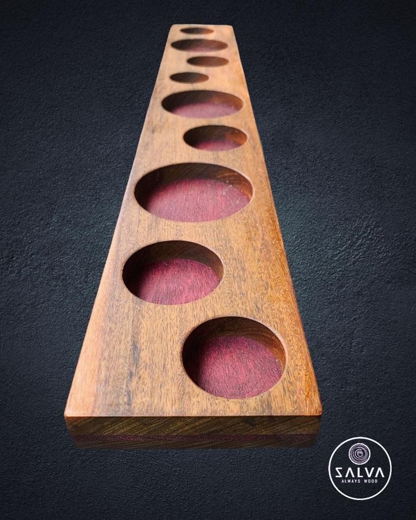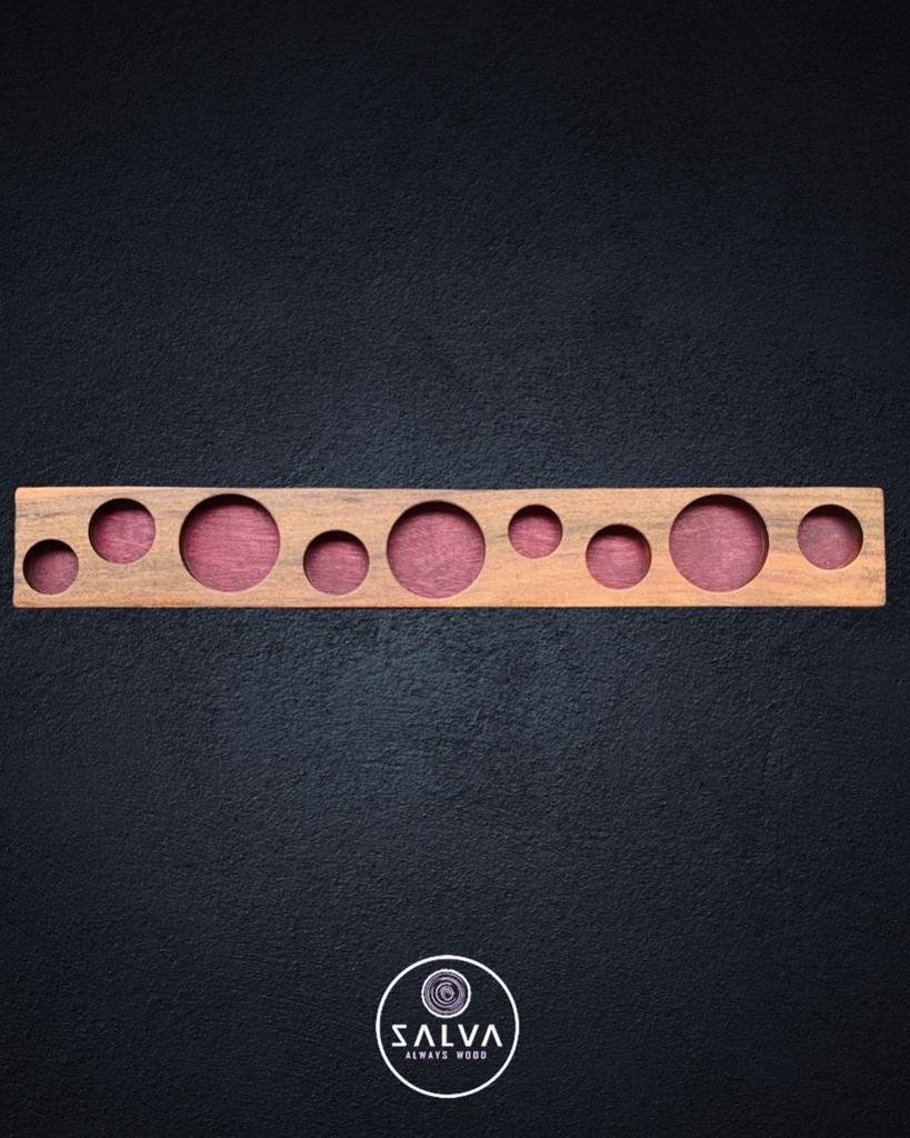 El Centro de Mesa de SALVA es una pieza versátil que combina utilidad y presencia estética. Su diseño con cavidades circulares talladas realza la riqueza natural de las maderas peruanas, creando un juego visual único.