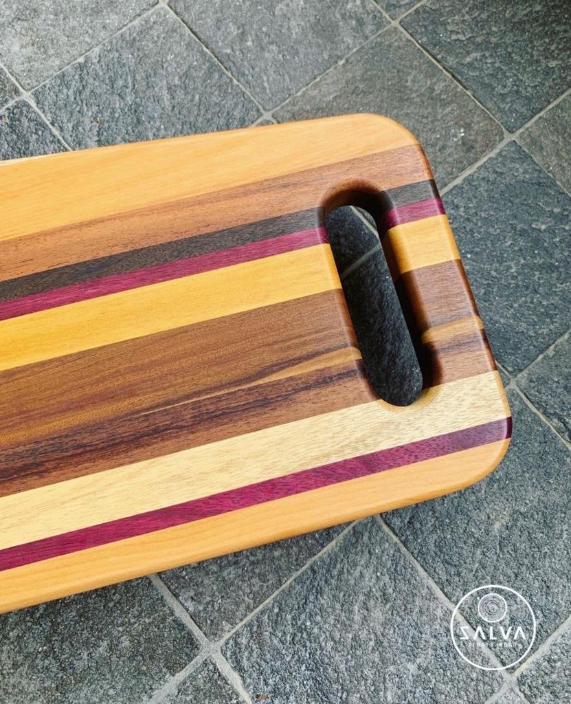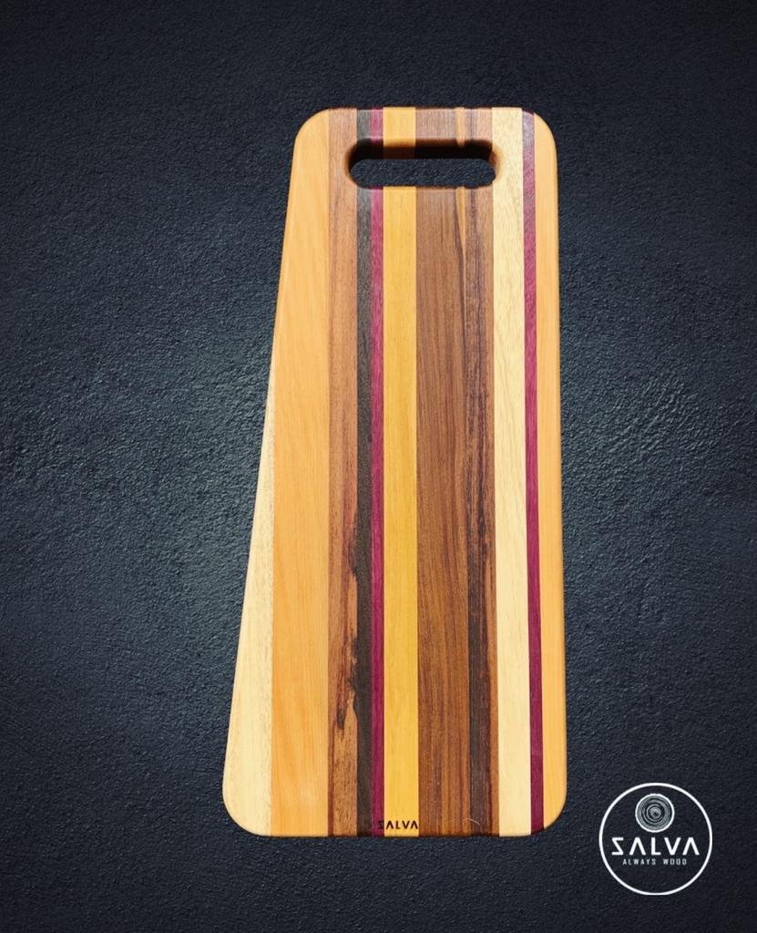 La tabla Diagonal de SALVA combina diseño contemporáneo con la fuerza natural de las maderas peruanas. Su forma estilizada y la disposición vertical de vetas y tonos resaltan la diversidad de la madera, creando una pieza llamativa y práctica al mismo tiempo.