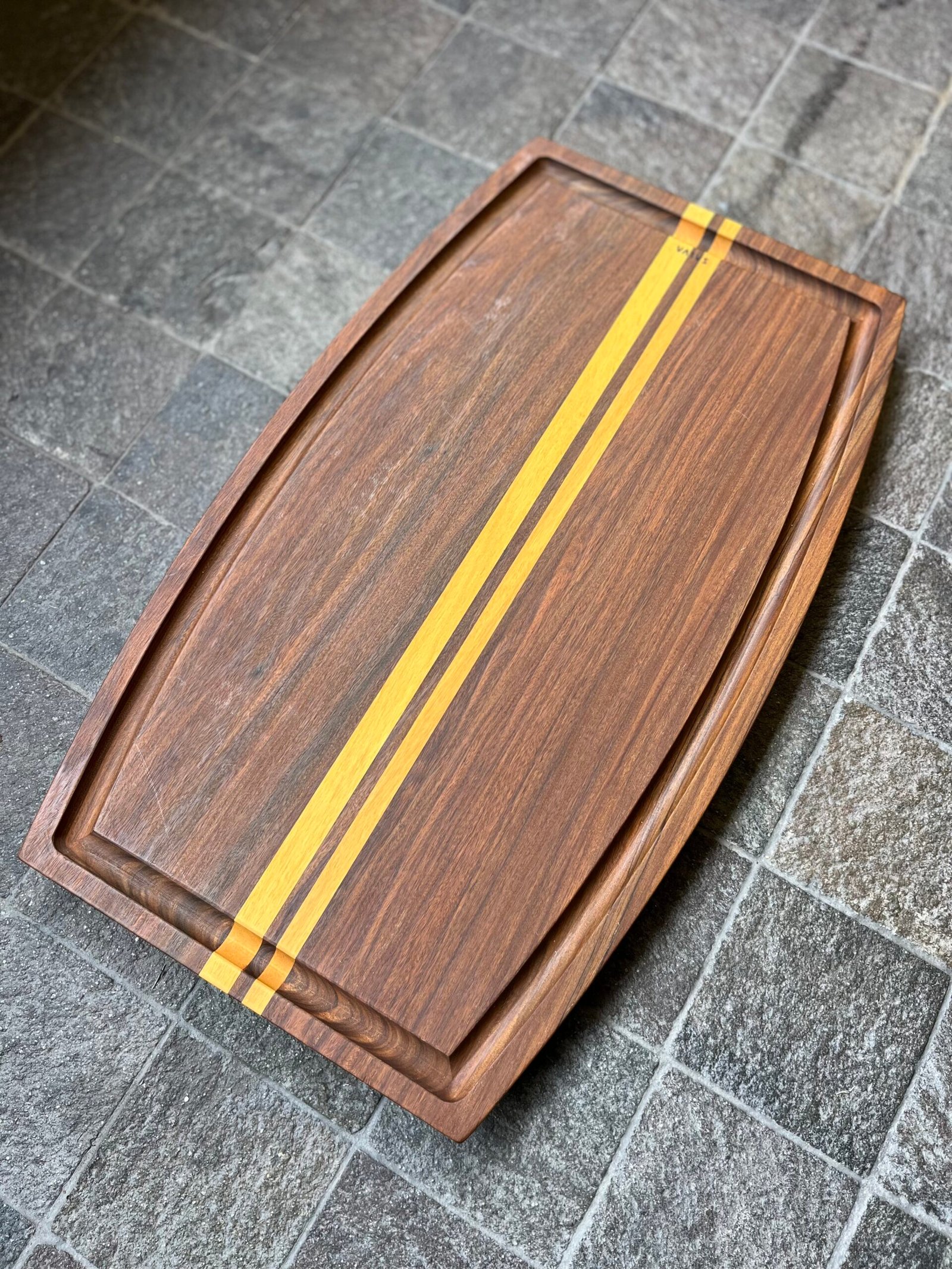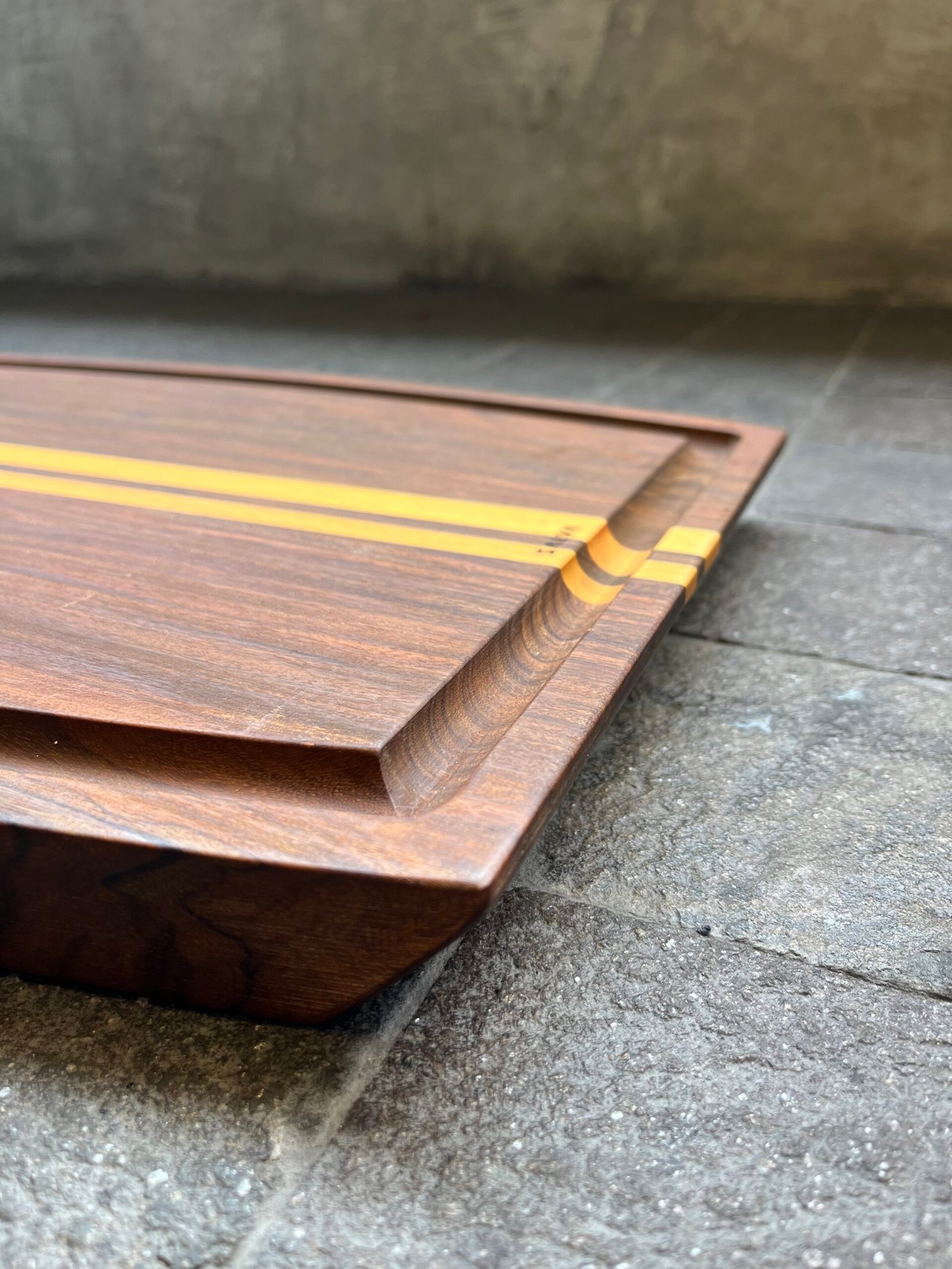 Es una tabla robusta y funcional, ideal para cortes de carne en la parrilla o la cocina, y lo suficientemente elegante para llevar directamente a la mesa. Su diseño curvo la hace ergonómica y práctica, uniendo resistencia, carácter y estética en una sola pieza.