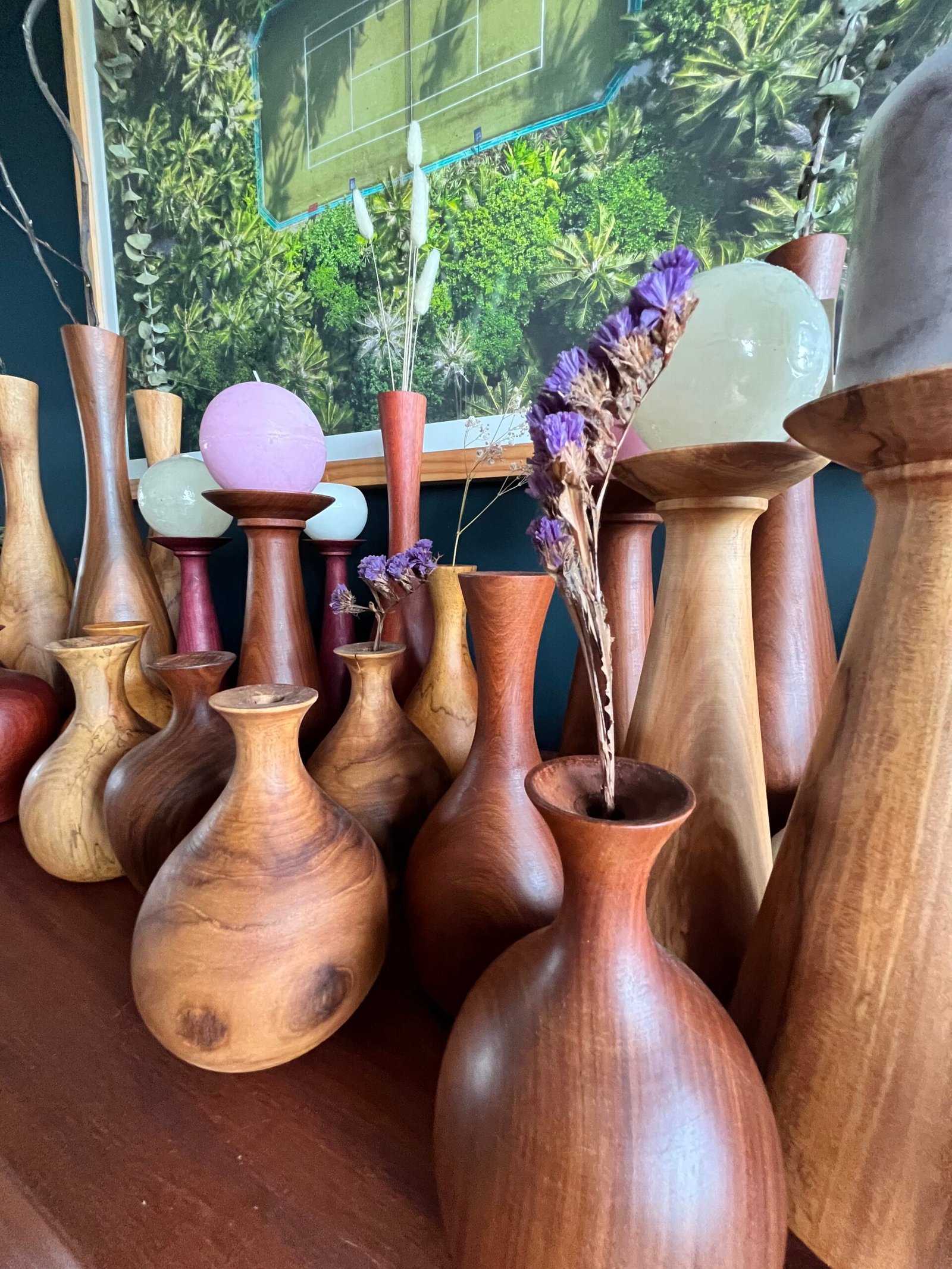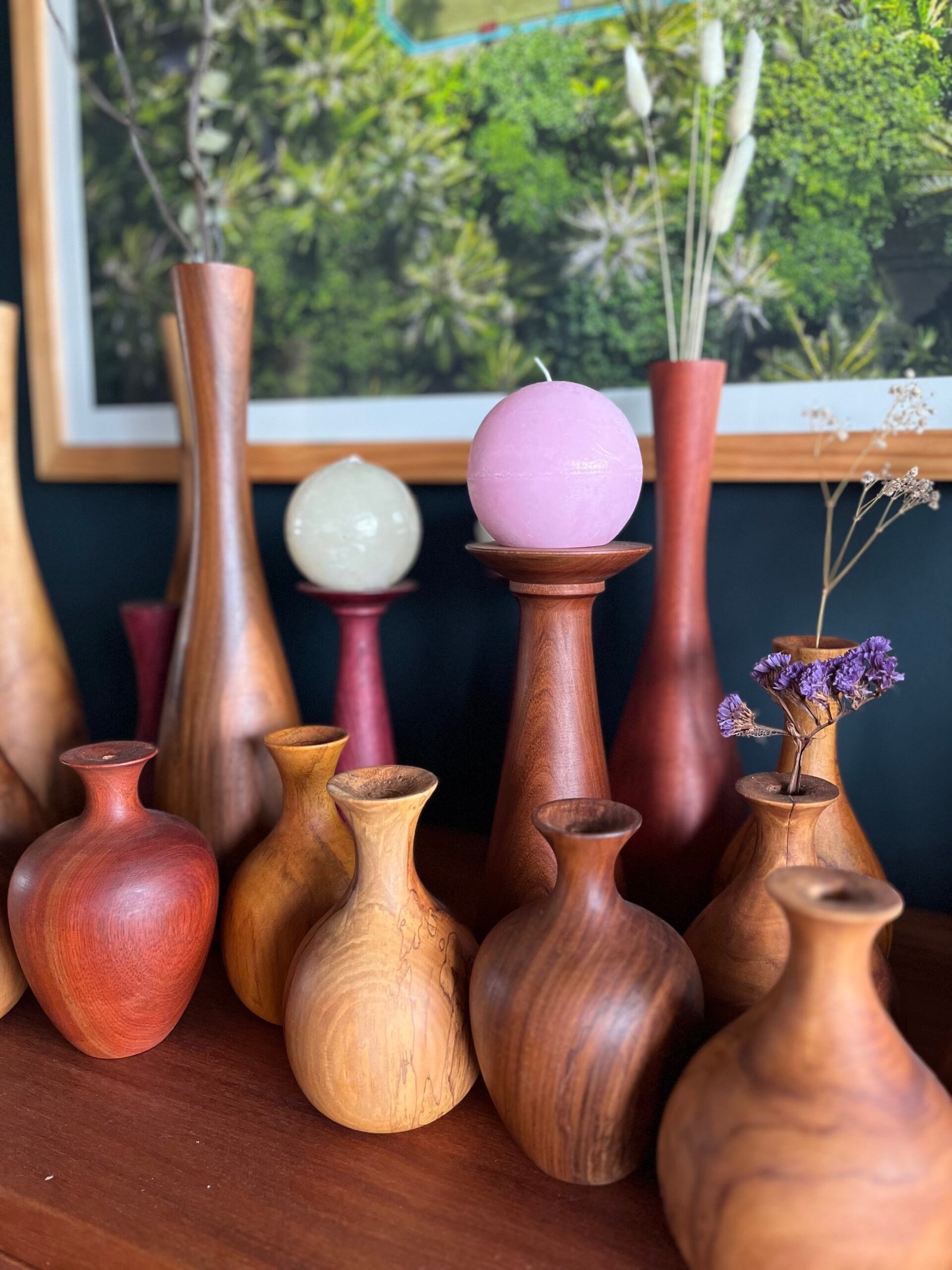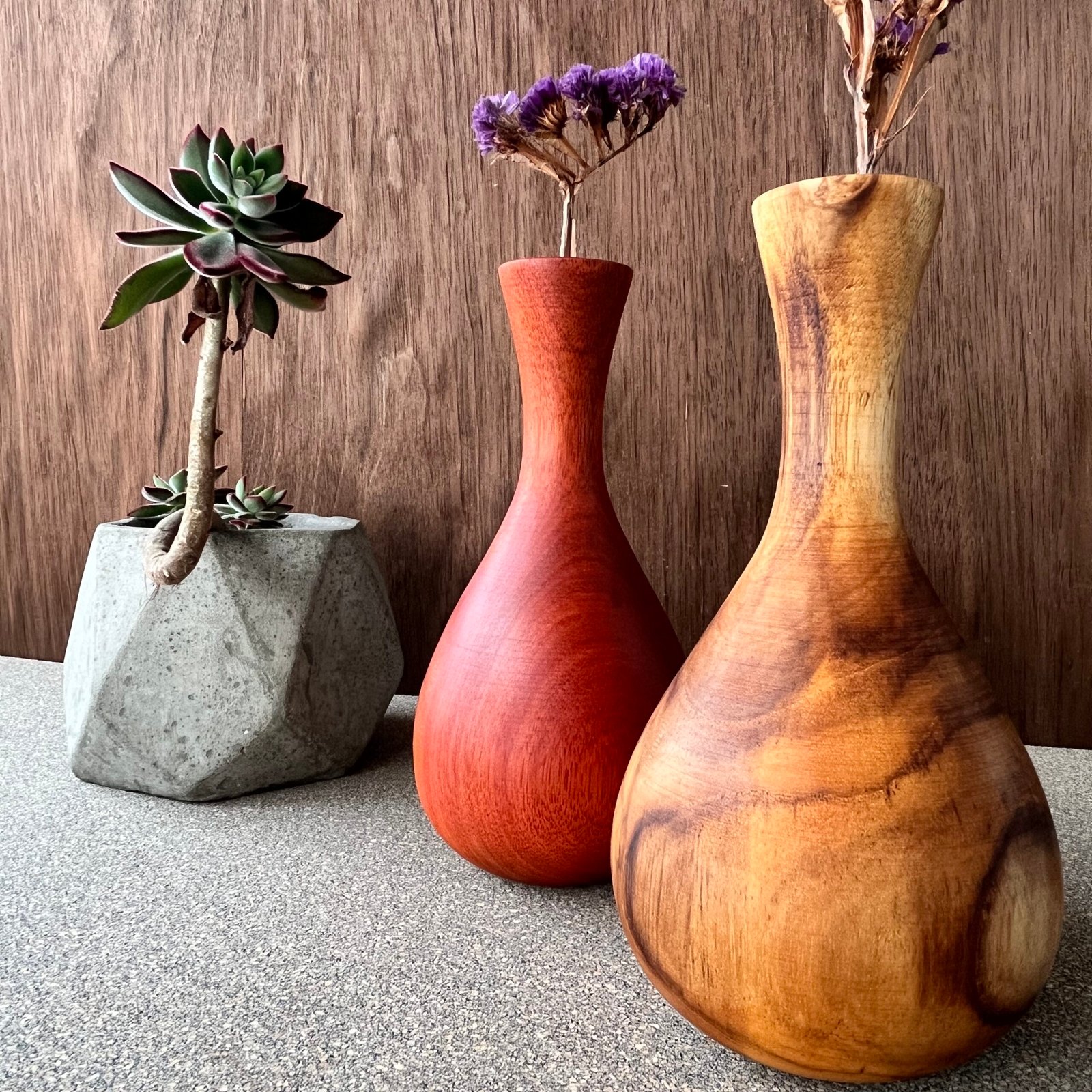 Fabricado artesanalmente, cada florero refleja la textura y el color únicos de la madera, lo que lo convierte en un objeto singular. Su diseño busca destacar las vetas y el origen del material, manteniendo un acabado sobrio que se adapta a distintos estilos de interior.